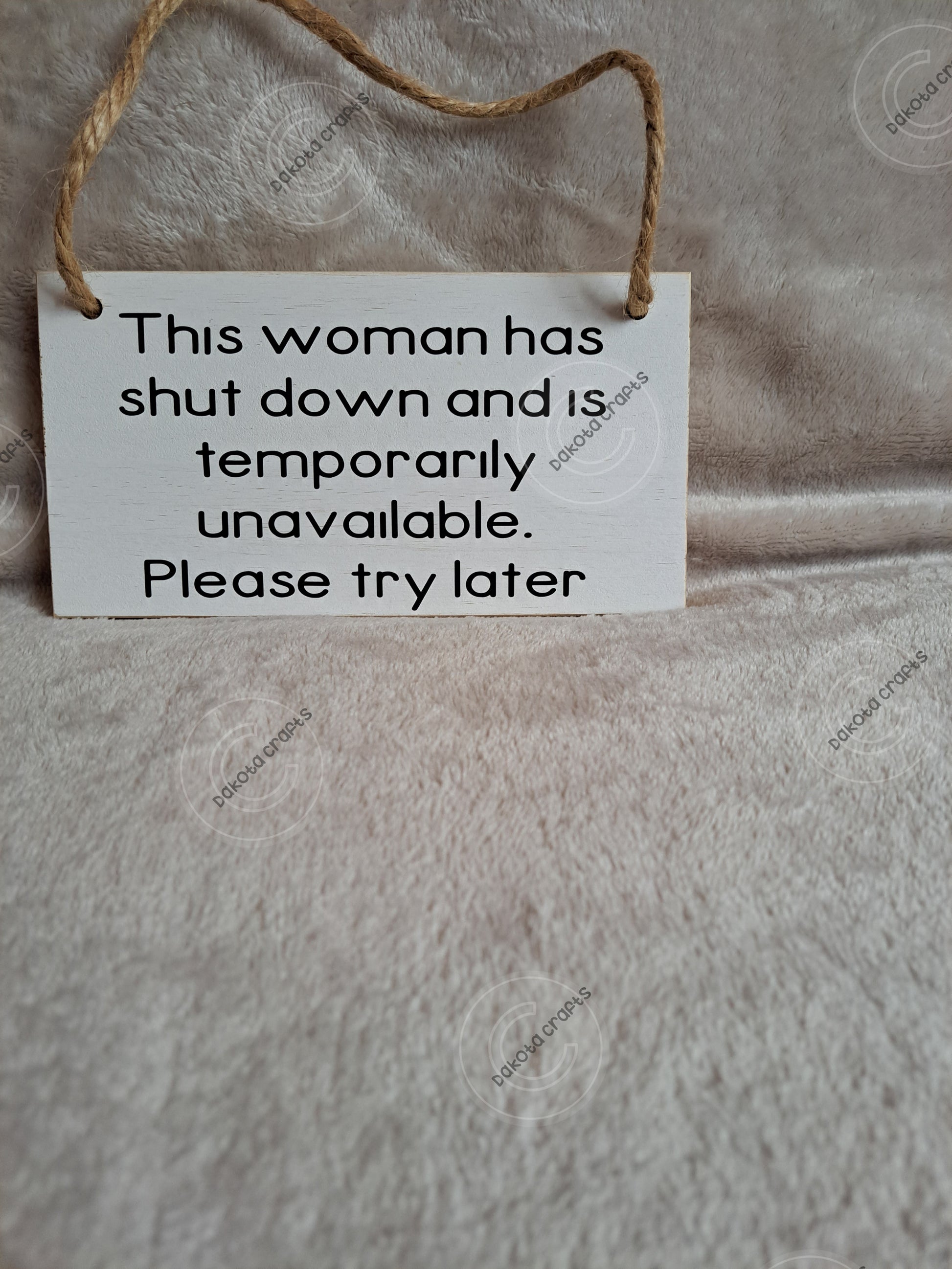 This wooden sign is temporarily unavailable because the woman in charge has shut down. But don't worry, you can try again later for a good laugh. This quirky and humorous sign will add a touch of fun to any room. Sorry for the inconvenience, but trust us, it's worth the wait!