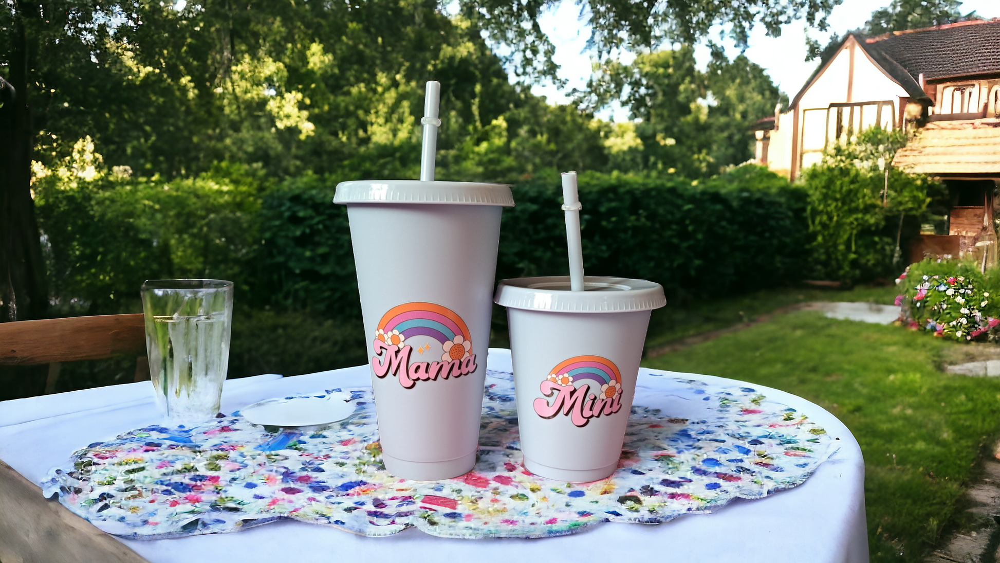 "Get double the rainbow fun with our Mama and Mini cold cup set! This set includes two sizes - 16oz and 24oz - perfect for you and your little one. The colorful rainbow design will brighten up your day (and your drink)! Sip in style and spread some joy with this adorable set."