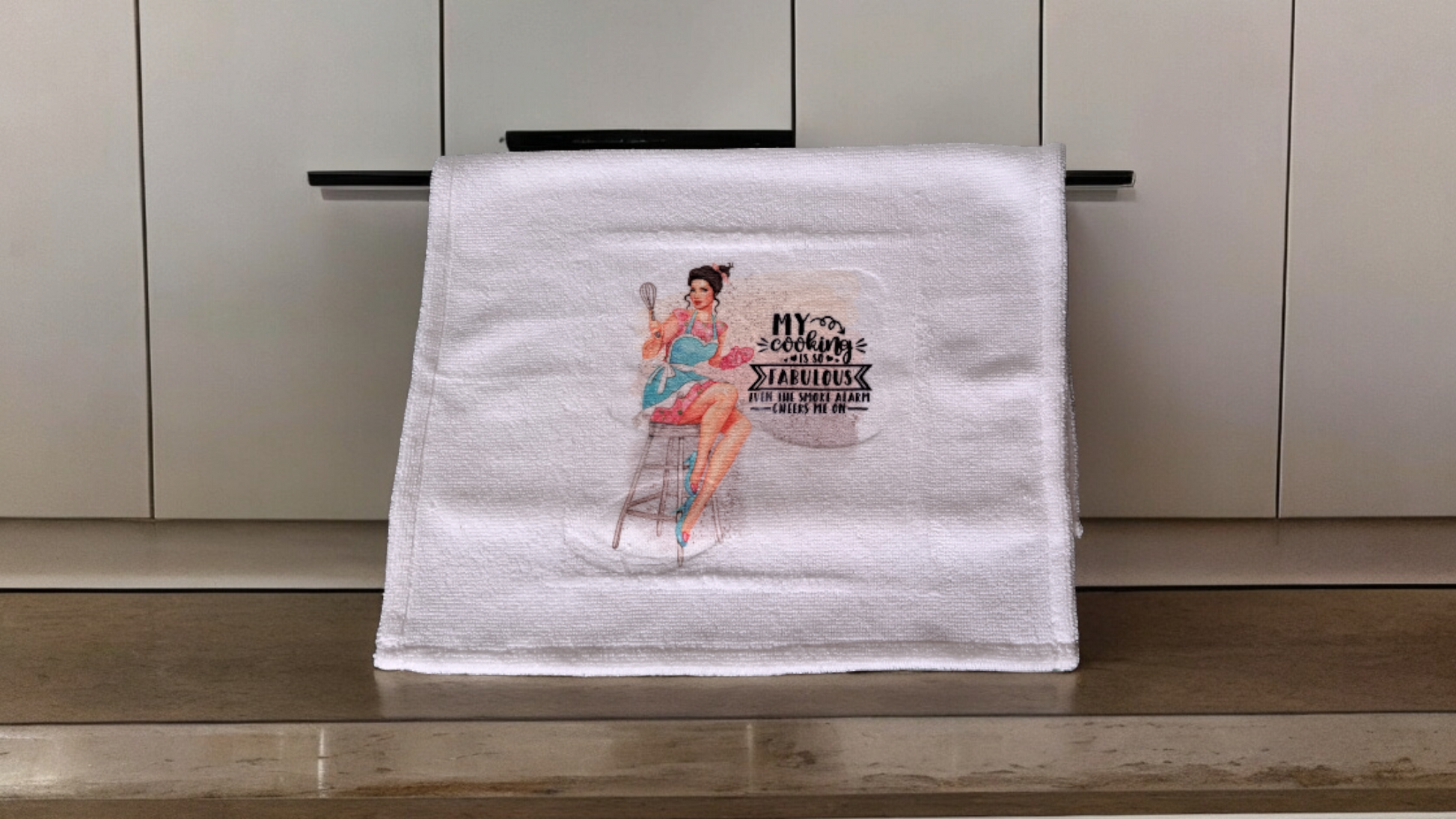 Spruce up your kitchen with this quirky tea towel featuring a playful pinup girl. Not only will it add a touch of humor to your cooking space, but it'll also remind you that even when your cooking sets off the smoke alarm, your skills are still amazing. Perfect for any chef with a good sense of humor!